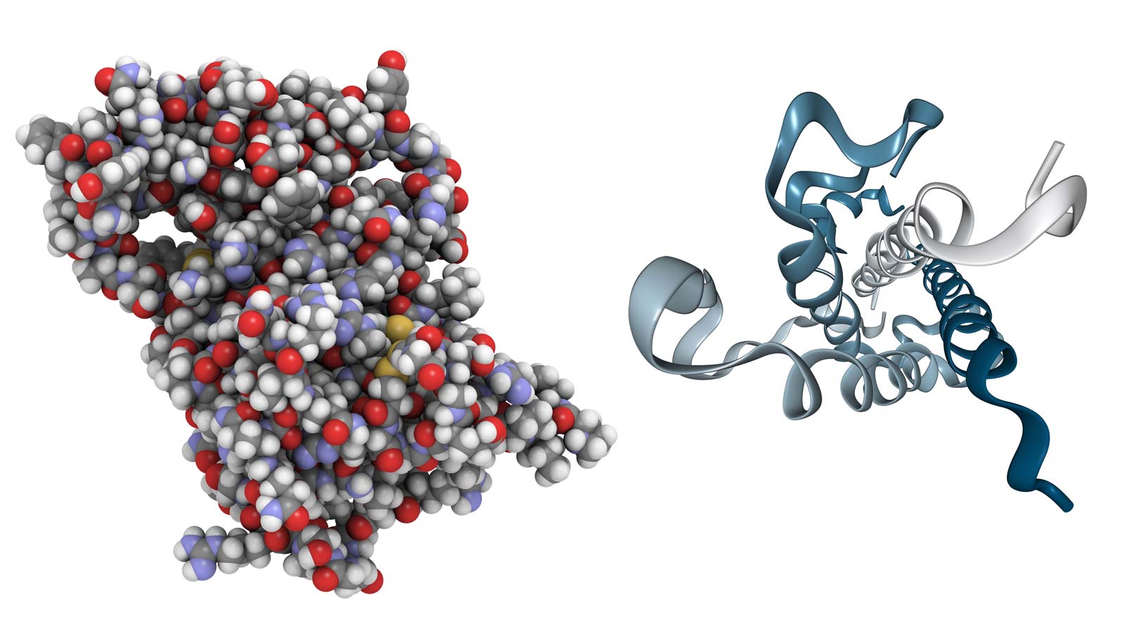 Chemical structure of human growth hormone. The image at left is a space-filling, all-atom representation, and the image on the right is a ribbon representation of the same protein.